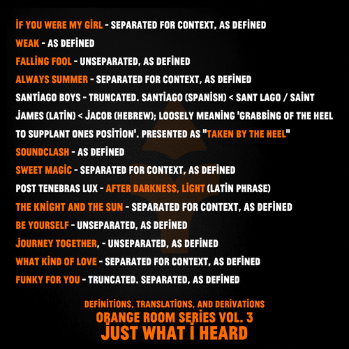 This story is one interpretation of that potential. It uses the words from the track titles or adjacent derivatives based on my limited perspective. Some of the track titles are remarkably intricate concepts. I've learned a great deal in my curiosity of them. This work may be a far cry from the original intent of what they are attempting to convey. The ideas expressed here are entirely my own and in no way associated to the artists intent. Just so, I am very much open to feedback and change if the meaning of that message is offered to me by the artists themselves. I hope this work of fiction is taken with a light heart by all who allow themselves to be entertained by it."